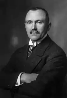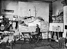 Kaiser Wilhelm II became an enthusiastic supporter and patron of the artist and Stöwer was said to be the Kaiser's favorite naval painter.[3] Stöwer even accompanied the Emperor on several voyages between 1905 and 1912. He was a board member of the German Navy League (German: Deutscher Flottenverein) and was awarded an honorary professorship in 1907. The course of his life then followed that of his patron and the fate of the Imperial German Navy. As with contemporaries such as Hans Bohrdt, his greatest creative period came to an end with the abdication of the Kaiser and the passing of the Imperial era. His later career, being without Imperial favor, relied on a few commissions from steamship lines. He died in relative obscurity at his Berlin-Tegel villa[lower-alpha 1] on 31 May 1931, nine days after his 67th birthday.[2] Stöwer is interred in Cemetery III of the Jerusalem and New Churches in Berlin, where the grave remains preserved.[5]