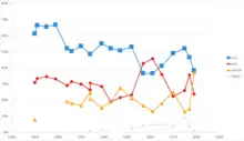 In elections to the London Borough of Merton, the seat returns all of the council's Conservative and Liberal Democrat councillors. Since 1990 the ward of Merton Park has only ever returned councillors for Merton Park Ward Residents Association.[3] Since 1994 the ward of West Barnes, which contains Merton's half of the town of Motspur Park, has swung between the Conservatives and the Liberal Democrats; the latter presently hold all three seats in the ward.[4][5][6][7] In the local elections in 2018, Liberal Democrat councillors were elected for the wards of Trinity and Dundonald for the first time in the borough's history, with a further first time win for the Liberal Democrats in a by-election in the Cannon Hill ward in 2019.