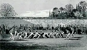 The earliest evidence of coloured shirts used to identify football teams comes from Winchester football: an image from before 1840 is entitled "The commoners have red and the college boys blue jerseys".[6] The use of coloured shirts at Winchester college is confirmed again in 1859: "Precisely at twelve o'clock, according to good old custom, the blue jerseys of college and the red of commoners mingled in the grand commencing "hot".[7] That same year, Winchester College played a match of an undefined variety of football against the Winchester Garrison Officers; 28 "goals" were scored, with 11 players on each side, leading the historian Ian Denness to suggest that the rules were a hybrid of the Winchester and Eton football games.[8]