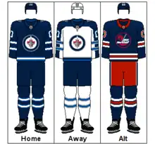 The Jets kept their existing uniforms when Adidas took over production of NHL uniforms in 2017. Prior to the 2018–19 season, the Jets introduced their first alternate uniform, featuring aviator blue as the base colour, along with a new "Jets" wordmark, block letters and numbers, and striping inspired from the 1990–96 uniforms of the original Jets.[62][63]
