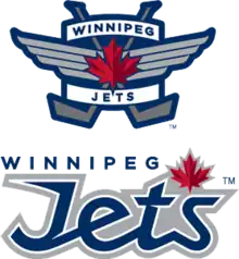 The main and initial secondary logos of the Winnipeg Jets (the wordmark at lower right has since been replaced by the script form on the current alternate jerseys). The primary logo incorporates the RCAF roundel, and was prominent on the uniforms of the Ottawa RCAF Flyers[53]