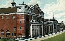 However, disaster struck the Exposition in 1901, when the complex was destroyed by a fire on St. Patrick's Day. The fire was caused by wind-blown embers from a nearby stable fire. The blaze engulfed the great Main Hall, leaving Machinery Hall the only surviving building on the six-acre site. Most of the Exposition was rebuilt at a cost of $600,000 and included new versions of Machinery Hall, the Main Hall and the Music Hall. The new Main Hall was constructed of steel, stone and massive brick walls. The Main Hall's heavy doors were adorned with cut white stone and the interior was decorated and illuminated by 1,500 incandescent lights under a vaulted and girdered ceiling.[2] However, by 1910, other cities that had been holding expositions dropped out of the field, but the Pittsburgh Exposition Society held on. Even while during the last decade, public interest in such affairs was declining, the society secured large attendance every year by increasing the facility's musical attractions by booking the greatest orchestras and bands of the country. The last exposition was held in the fall of 1916. On that occasion, the receipts fell off from the average of about $30,000, and the returns did not pay the expenses of the season. Over the next two years, hosting an exposition was deemed impossible, due to World War I and a polio epidemic.[1]