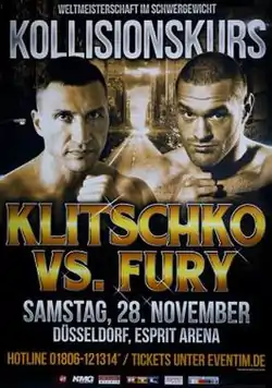 Wladimir Klitschko vs. Tyson Fury, billed as Kollisionskurs (German for Collision Course), was a professional boxing match contested between WBA (Unified), IBF, WBO, IBO, and The Ring heavyweight champion, Wladimir Klitschko, and Tyson Fury. The fight took place on 28 November 2015 at the Esprit Arena in Düsseldorf, Germany. Fury was declared the winner by unanimous decision.[1] This ended Klitschko's reign of nearly 10 years, the second longest in heavyweight history.[2] Klitschko was entitled to a rematch per the fight contract.[3][4] Despite this, Fury was stripped of the IBF heavyweight title for agreeing to the rematch instead of facing the IBF mandatory challenger, Vyacheslav Glazkov.