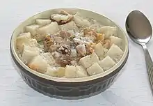 Wodzionka (Silesian: wodźůnka / wodziōnka), kapłonek or brotzupa – in Polish cuisine, a Silesian and Central Poland[note 1] bread soup made from stale bread, fat and water or milk.[1][2][3][4] Traditionally, wodzionka is prepared by soaking two- to three-day-old stale bread in water or broth and adding garlic, bay leaves, black pepper and other seasonings, fried bacon, and lard or butter. It was reportedly served in late autumn and winter, when cows had less milk.[5]