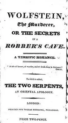 - ↑ Wolfstein, the Murderer; Or, The Secrets of a Robber's Cave: A Terrific Romance. To which is Added, The Two Serpents, an Oriental Apologue.