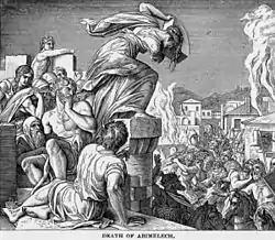 The woman of Thebez is a character in the Hebrew Bible, appearing in the Book of Judges. She dropped a millstone from a wall in order to kill Abimelech.