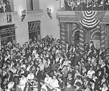 During the 1916 Democratic National Convention, suffragists staged a demonstration.[46] The idea for the silent protest came from Emily Newell Blair in February earlier that year.[47] More than 3,000 women lined twelve blocks along Locust Street, wearing white dresses, "votes for women" sashes and holding yellow umbrellas.[46][48][47] They did not move or talk and the event, which was organized by Edna Gellhorn, was called a "walkless, talkless parade," or the "Golden Lane".[46][49] The demonstration was meant to show how women had been silenced by not being allowed to vote.[49] The event gained national attention in the media.[50] The Democratic delegates voted to support women's suffrage on a state by state basis.[51] Also in June, during the 1916 Republican National Convention, women sent telegrams to the Missouri electors to convince them to support women's suffrage in the Republican platform.[52] The Republican convention declined to support a federal suffrage amendment, but instead supported suffrage by state.[52]