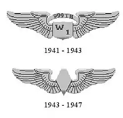 The first seven classes of WASP flight school graduates in 1943 were issued silver wings with a central shield-shaped escutcheon, with the class number engraved on it. On the scroll above the shield, where the 999th appears, was the squadron number of the Training Command. The first two classes were marked with the 319th, and thereafter the 318th for the remaining five classes in 1943.