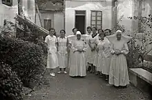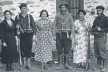 Nationalist supporting women behind Nationalist lines also sometimes were involved in auxiliary roles. This included working as nurses, provisioners and support personnel.[33][32] They were encouraged to do so by men as a means of supporting the traditional Spanish family structure.[32]