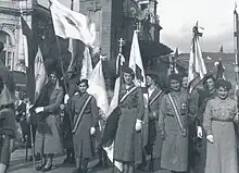 While other communist organizations existed, Partido Comunista de España remained the dominant one.[12][3] In the first year of the Civil War, the Partido Comunista de España rapidly increased their membership by nearly three-fold. Among the peasantry, women represented nearly a third of PCE's membership.[28] During the Civil War, Ibárruri earned herself the nickname La Pasionaria as she traveled the country to speak in opposition to Francoist forces. She also used radio to spread her message, becoming famous for calling men and women to arms, saying, "¡No pasarán!". One of the most famous phrases she uttered in the civil war was "It is better to die on your feet than live on your knees". The Communist Party did not approve of her private life though, asking her to end her relationship with a male party member who was seventeen years younger than her, which she did.[29] Female Stalinists actively participated in POUM and Trotskyite purges in Barcelona. Women like Teresa Pàmies intentionally excluded POUM affiliated women even as they tried to build bridges with PCE.[25]