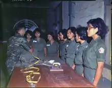 Several million Vietnamese women served in the military and in militias during the War, particularly in the National Liberation Front of South Vietnam (also known as the Viet Cong), with the slogan "when war comes, even the women must fight" being widely used.[4] These women made vital contributions on the Ho Chi Minh trail, in espionage efforts, medical care, logistical and administrative work, and, in some cases, direct combat against opposing forces.[5][6]