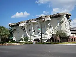 Each WonderWorks location contains interactive entertainment exhibits on the themes of space, physics, and math. Some locations also offer a dinner magic show, as well as a 4D XD motion theater. Each WonderWorks building is designed to look as if an existing building was ripped free of the ground by severe weather and dropped upside down on its roof. This unique design is credited to the Orlando architect Terry O. Nichoson of Nichoson Design International, at WonderWorks' original Orlando location. Nichoson went on to serve as the main design consultant for all subsequent WonderWorks locations.[2][3] 5 of the 6 locations offer laser tag and a multi-story ropes course. The Myrtle Beach location has an outdoor ropes course and zip-line, The Branson Location is the only location that doesn't have a ropes course.[4][5] Most WonderWorks locations are open 365 days a year and it takes about 3–4 hours to tour each attraction.[6]