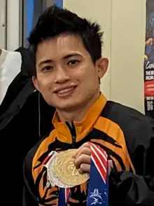After the start of the COVID-19 pandemic, Wong's first competition was the 2021 SEA Games (hosted in 2022) where he did not place in changquan. A year later at the 2023 SEA Games, he won the bronze medal in changquan and the silver medal in jianshu and qiangshu combined.[15][16] He then competed in the 2022 Asian Games in men's changquan but did not place.[17] A few months later, Wong competed in the 2023 World Wushu Championships and won the gold medal in changquan as well as silver medals in jianshu and qiangshu, becoming one of three triple medalists at the competition and winning his second world title.[18][19][20]