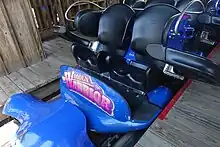 The ride runs one train, with twelve riders arranged in six rows of two across.[12] The train is a Timberliner manufactured by Gravitykraft, and the ride was the first in the United States to use the Timberliner.[11] The Timberliner train features hydraulic restraints,[13] accommodating more guests and allowing it to have a 40-inch (100 cm) height limit.[14] The ride has 1,239 feet (378 m) of wooden track. In total, the ride was constructed with 140,000 board feet of pressure treated Southern pine,[15] alongside 200,000 nails, and 35,000 nuts and bolts.[4]