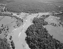Aerial view of Woods Mill showing the aftermath of Hurricane Camille, including evidence of flood damage