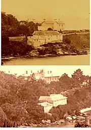 The two houses called Woollahra House. The top photo shows the first house built in 1856 by Sir Daniel Cooper, and the bottom photo, with the same outbuildings in the foreground but a larger house in the background, shows the second Woollahra House built in 1883 by William Charles Cooper.