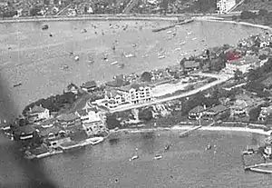 Aerial photo showing Wyuna Court (labelled) and the still bare demolition site of Woollahra House, 1931