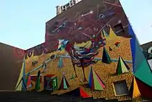 He began in 2005, with a 6 x 25m mural named My Neighbourhood, part of a collaboration project with his friends and fellow street artists Os Gemeos.[11] Five years later Woozy painted a massive 25 x 15m wall at the most central part of Athens, outside the Monastiraki metro station. Titled as The Colorful Warrior this piece was done as part of a reconstruction pilot program. Along with Colorful Tsunami, a 20 x 12m mural in central Athens, they remain some of Woozy’s most renowned murals in the capital.[12] In 2011 his work was featured at the Athens Concert Hall, with his commissioned piece Music For Your Eyes.[13]