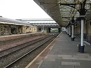 The station was built with yellow Crewe bricks and had four tracks running through the station. Two of the tracks which are not served by platforms were once used to stable Travelling Post Office carriages. There was also a twelve road engine shed, wagon repair shops, a coaling stage, a goods shed and a stable block, all built with local sandstone. In LMS days, a new turntable was installed behind the engine shed. In British Railways days the engine shed was rebuilt with a new roof and ferro-concrete coaling stage and an ash disposal plant was built near to the new turntable. The road approach to the station entrance was remodelled in BR days when the highways near to the station were upgraded. Immediately adjacent to the southbound platform are two carriage sidings, used for stabling & servicing empty DMU sets overnight and at weekends. There is also a train crew depot here.