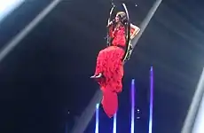 The stage setting of both bands were also different.[19][20] Within Temptation presented a stage with a fantasy and futuristic ambience.[21] It contained a large mechanical sculpture at the center, which depicted the face of a creature.[19] The piece was a central element of the concert, as the sculpture moved and came apart at certain parts of the show. During the song "Angels", lead vocalist Sharon den Adel sang atop of the sculpture, lifted by an elevator,[20] with flaming wings projected behind her.[22] It was the same face which appeared in their music video of "The Purge", but on a bigger scale.[18] For the song "All I Need", den Adel was suspended again, this time performing the song sitting on a swing in the form of a ring and within a circle of lights. The band also made use of screen projections, fog machines and pyrotechnics.[20]