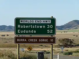 Worlds End Highway is a road in the Yorke and Mid North region of South Australia running north from Eudunda through Robertstown to Goyder Highway 18 km southeast of Burra.[3] The northern terminus of the highway is in a locality named Worlds End, leading to the name of the highway.