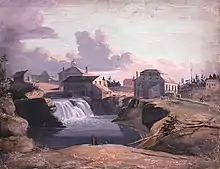 A painting of Hull and the Chaudière Falls in 1830 by Thomas Burrowes. Bytown, in its infancy, can be seen across the Ottawa River.