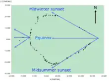 A series of stones, located to the west of the arrangement's western apex, mark the positions of the setting sun at the equinoxes and solstices.[10] A survey study shows that these alignments are accurate to within a few degrees. Additionally, the straight sides of the arrangement, which diverge from its eastern apex, also indicate the setting position of the sun at the solstices to within a few degrees and at the equinoxes the sun sets over the three prominent stones at the apex.[3]
