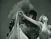 Mylène Farmer, hooked at the front of the 1910 locomotive used in Richard Attenborough's film Chaplin, wears a dress made by fashion designer Thierry Mugler.