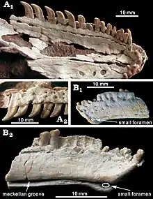 It differed from other troodontids in that the front end of the dentary of the lower jaw was downturned, similar to what is seen in therizinosaurian theropods. The mandibular symphysis (the area where the two halves of the mandible connected at the front) was short, and this region was slightly curved towards the middle. Two rows of foramina ran along the outer side of the dentary, just below the first seven dentary teeth (only one of the rows continued hindwards past the seventh of these teeth). The foramina lay in a groove, which is a distinct feature of troodontids, while the inner surface of the dentary was smooth. A narrow, deep Meckelian groove ran at the inner side of the dentary, just above its lower margin, towards the front of the mandibular symphysis. Just behind the symphysis and below the Meckelian groove, a distinct foramen was present, similar to the condition in Urbacodon. On the outer side of the dentary, at the level of the Meckelian groove, there was a shallow groove with elongated pits.[1][7]