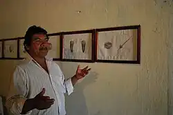 Ireneo Santa Ana Guerrero explaining images of textile weaving at the Amuzgo Community Museum