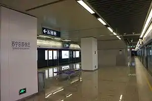 Xuzhuang / Suning HQ station (Chinese: 徐庄·苏宁总部站; pinyin: Xúzhuāng / Sūníng Zǒngbù zhàn), also known simply as Xuzhuang station.(Chinese: 徐庄站; pinyin: Xúzhuāng zhàn), is a station on Line 4 of the Nanjing Metro. It opened on January 18, 2017 alongside seventeen other stations as part of Line 4's first phase.[1] The station is oriented on an east–west axis, underneath Suning Avenue and Donglai Street. The station is named after the nearby Xuzhuang Software Park and the headquarters of Suning Commerce Group, a Nanjing-based company.[2] A mural inside the station's mezzanine level depicts the software and technology industry of the titular software park.[3]