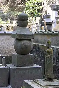 Inside a yagura, the grave is often marked by a stone gorintō, hōkyōintō (Buddhist tower), or other stone monument. These are normally later additions.[1] Other Buddhist imagery, such as statues of Jizō are commonly found, as in most Japanese cemeteries. Red painted rafters are visible on the ceiling of the Shutarugi Yagura (朱垂木やぐら).