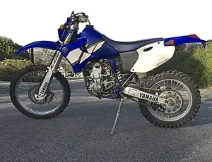 The Yamaha WR250F is an off-road motorcycle made by Yamaha Motor Company. It has a 250 cc (15 cu in) liquid-cooled single nikasil coated cylinder engine. First offered in 2001, it shared many components and design concepts with the YZ250F motocross model. It is basically the YZ250F detuned slightly for more controllable power, with a headlight, lighting coil, softer suspension, a kickstand, better noise specifications, larger radiators, and lower emissions. The WR250F is basically a YZ250F modified for enduro competitions, extreme enduro competitions and hard enduro competitions and the practice of these extreme sports.[3] The WR in the name indicates a wide-ratio gear box common to most enduro or trail bikes and stands in contrast to the close-ratio gearbox essential to a motocross racer. Over the years the WR250F has benefited from the advances made in the YZF motocross version, gaining advancements such as an aluminum frame and improved suspension.