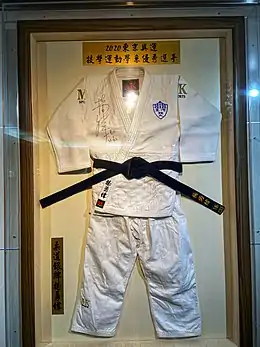 Yang's judo uniform was shown outside the Department of Combat Sport, National Taiwan University of Sport.