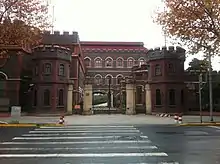 The buildings and its perimeter wall were designed to resemble English castles featuring pink and grey brickwork and mock turrets. At the top of the walls and on the roofs are crenellation to resemble a castle's parapet.