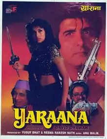 Yaraana (transl."Friendship") is a 1995 Bollywood romantic thriller film directed by David Dhawan and starring Madhuri Dixit, Rishi Kapoor, Raj Babbar, Kader Khan and Shakti Kapoor.[3][4] It is loosely based on the American film Sleeping with the Enemy, starring Julia Roberts.[5] The film is known for the hit song "Mera Piya Ghar Aaya".[6]