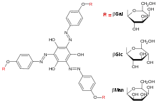 Yariv reagent. Three example R groups shown: β-D-Galactose (βGal), β-D-Glucose (βGlc), β-D-Mannose (βMan).