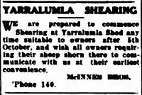 Mcinnes Brothers started their shearing contractor business in 1904.[13] They hired teams of shearers and supplied them with the necessary equipment. They then either sent the teams to individual properties in the district to shear the sheep or they kept them at the Yarralumla Woolshed and the farmers brought their sheep here to be sheared. An advertisement for this latter activity is shown. The Mcinnes family continued their association with the shed until the 1960s. An article in the Canberra Times of 1967 featured the shearing contractor Les McInnes, the son of Andrew McInnes, at the Yarralumla Woolshed.[14]