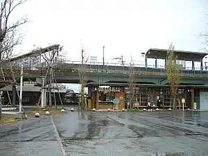 The station consists of an island platform serving two elevated tracks. There is no station building only a shelter on the platform for waiting passengers. Benches are also provided on a paved area under the elevated structure as a form of waiting area. Access to the platform is by a flight of steps or an elevator. A designated parking area for bicycles is provided underneath the elevated structure.[2][3][5]