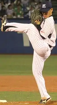His unusual pitching form, most notably his leg kick, earned him the nickname "Ryan" for it was fashioned after the style MLB Hall of Famer Nolan Ryan.[21] Listed at 171 cm (5 ft 7 in), he may lack the advantage of having longer limbs for extra power, but his form has a slower rhythm to it, making his pitches more difficult to time.[4][22] With an overhand delivery, he throws a four-seam fastball typically at high-80s mph (tops out at 150 km/h or 93 mph).[23] He can throw decent two-seamers and cutters, sliders, and forkballs.[24]
