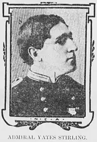 On 23 February 1900 he joined the USS Celtic (AF-2), and on November 21 of the same year, reported for duty to his father, then a captain and the commandant of the Naval Station, San Juan, Puerto Rico. Following his father's promotion to rear admiral in June 1902, the elder Stirling was named commandant of the Puget Sound Navy Yard, where Yates Jr. joined him shortly thereafter as an officer of the yard.[32] The elder Stirling was commander-in-chief of the United States Asiatic Fleet from 11 July 1904 to 23 March 1905[33] before retiring from the Navy on 6 May 1905 at the mandatory age of 62. During the time he commanded the Asiatic Fleet, his flag was on the USS Wisconsin (BB-9) and Yates Jr. served as his flag lieutenant.[34] While he was with the Asiatic Fleet, Stirling also had staff duty on the USS Rainbow (AS-7). In mid-April 1905, Stirling, his father and their wives returned to the United States from Yokohama, Japan, aboard the steamship S.S. Korea after the elder Stirling detached from command of the Asiatic Fleet.[35] In 1905–1906, Stirling remained at sea in the USS Massachusetts (BB-2) and later, USS Indiana (BB-1). In the rank of lieutenant commander he reported on October 1, 1906, to the Naval Academy and while on duty there made a cruise on the USS Arkansas (BB-33) in the summer of 1907. Detached from the Naval Academy in June 1908 he next served on the USS Connecticut (BB-18), flagship of Admiral Charles S. Sperry Commander in Chief, Atlantic Fleet as gunnery officer. Stirling joined Connecticut, at San Francisco, where it was then en route as flagship of the Great White Fleet on a global circumnavigation. Following refit at Mare Island Naval Shipyard, the fleet stood out on the next leg of the voyage on 7 July, reaching Hawaii on 16 July. Sailing from Hawaii, the fleet made ports of call at Auckland, New Zealand; Sydney and Melbourne, Australia; Manila, Philippines; Yokohama, Japan; Colombo, Ceylon; arriving at Suez, Egypt, on 3 January 1909.