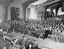 Büchler pictured in front row wearing shorts at a Shavuot service in recently liberated Buchenwald concentration camp, 18 May 1945