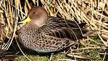 The yellow-billed pintail has a brown head and neck. The bill is yellow with a black tip and a black stripe down the middle. [8] The tail is brownish and pointed. The upper wing is grayish-brown, and the secondaries are blackish-green. The rest of the body is buffish brown with varying-sized black spots. The species is sometimes confused with yellow-billed teal (Anas flavirostris) but can be differentiated by the yellow stripes on its bill, its larger size, and its tendency not to form large groups.[9] The nominate subspecies is smaller and darker than Anas g. spinicauda. The yellow-billed pintail forms a superspecies with the northern pintail (Anas acuta).[10]