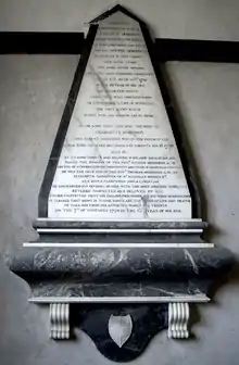 • Sir Edward Cary (died 1654) of Dungarvon, Ireland, and of Bradford, Devon (elder nephew). He was knighted in Ireland in 1625 by his cousin Henry Cary, 1st Viscount Falkland.[27] He died in 1654 and was buried in Marldon Church, South Devon. "In the east window of the south aisle are some remains of old glass, bearing the arms of the Cary family. In the chancel are several old tombstones, one, with an inscription in memory of Edward Cary, bears the date 1654" (Stabb).[28] He married Margaret Blackhurst of Lancashire, whose monument survives in Marldon Church.[27]