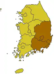 The region includes the modern-day provinces of North and South Gyeongsang and the self-governing cities of Busan, Daegu, and Ulsan. The regional name is used (with a slightly different spelling) as the name of Yeungnam University.