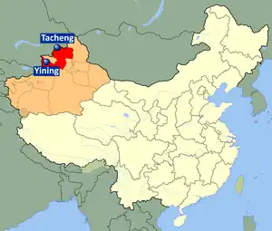 The abbreviation "Yi–Ta" (伊塔) is derived from the Chinese names of the two prefectures where the exodus and protests took place, Yili (伊犁州) and Tacheng (塔城地区).[1] Yi–Ta may also refer to each prefecture's capital, Yining (伊宁市) and Tacheng (塔城市), respectively.[1] Some scholars use the abbreviation "I–Ta", derived from the prefectures' Kazakh names, Ili and Tarbagatai.[2]
