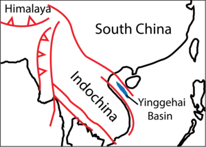 Yinggehai basin is lies at the southern end of the Red River fault zone, located at the Gulf of Tonkin. The tectonic origin of Yinggehai basin is controversial.[3] However, it is generally agreed that the basin is opened by the southeastward slip and clockwise rotation of the Indochina block along the Red River fault zone,[4] and that the basin is formed by deformation related to the strike-slip tectonism. The evidence includes the northwest–southeast elongation of the basin, its location at the southern end of the Red River fault zone, and that the basin is bounded by steep faults developed parallel to the Red River fault. What is not agreed is how much motion that has been along the Red River fault during the opening of the basin.
