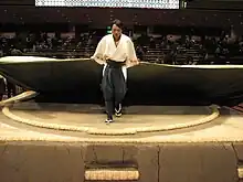 A yobidashi (呼出 or 呼び出し, lit. 'call'), often translated in English as "usher",[1] "ring attendant",[2] or "ring announcer",[3] is an employee of the Japan Sumo Association, responsible for various tasks essential to the traditional running of professional sumo tournaments (honbasho) in Japan. The yobidashi are involved in building the dohyō (wrestling ring) or calling wrestlers, or rikishi, to the ring when it's their turn to fight. They are also entrusted with other roles, both administrative and artistic, in the service of the stable to which they are attached.