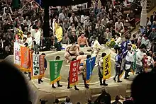 Another recognisable task of the yobidashi is parading the kenshō (advertising) banners around the ring before particular match-ups between popular wrestlers, which are often sponsored by companies.[17] The yobidashi are responsible for banging the taiko drum at different times of the day.[8] Originally, these different times were used to convey different messages to spectators outside the arena. The first drum sound is the ichiban-daiko (一番太鼓), played during the 15 days of the tournaments, for 30 minutes from 8am to announce the opening of a day of matches. At the end of the day, immediately after the yumitori-shiki (bow-twirling) ceremony, the hane-daiko (跳ね太鼓) is played to invite spectators leaving the arena to disperse.[8] Before the Second World War, the yobidashi took part in the tours separately and by ichimon (clan), therefore the method used to beat the drum was different and these variations are traditionally preserved today, even if all yobidashi now take part in the tours equally.[7] High-ranking yobidashi finally accompany sekitori-ranked wrestlers in their dohyō-iri ring-entering ceremonies by sounding their hyōshigi, an instrument consisting of two pieces of cherry wood tied together with a cord.[10]