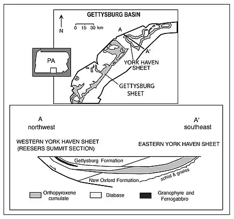The York Haven Diabase is a rock formation in Pennsylvania, United States. It underlies the Rossville Diabase and is Jurassic in age.[1] The formation is volcanic to subvolcanic, with a mafic composition and is categorized as a basalt.[1] The York Haven Diabase is a member of the larger Gettysburg Basin.[2] It plays an important role in United States history as the diabase outcrops were useful barriers in the union's strategy against the confederates at the Battle of Gettysburg.[3]